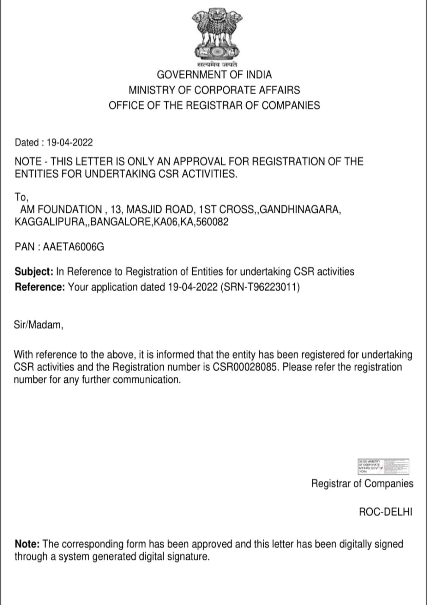| Section 80G Registration | AAETA6006GF2022301 |